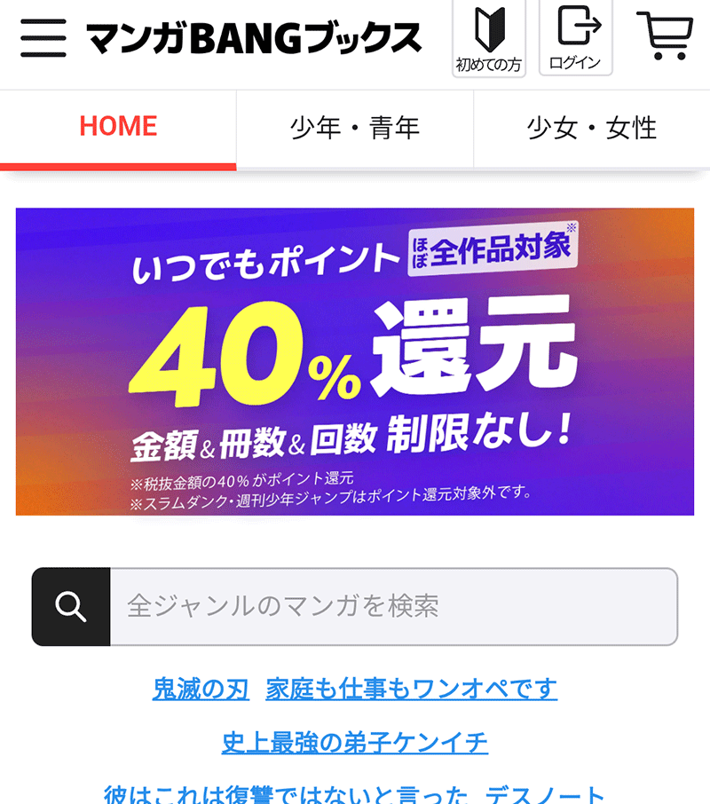 主な キャンペーン ※過去例含む | ![]() ●ポイント25%以上還元 ●初回購入70%OFF ●まとめ買いで15%OFF ……等 | ![]() ●指定ジャンル50%OFF ……等 | ![]() ●100円OFFクーポン ……等 |