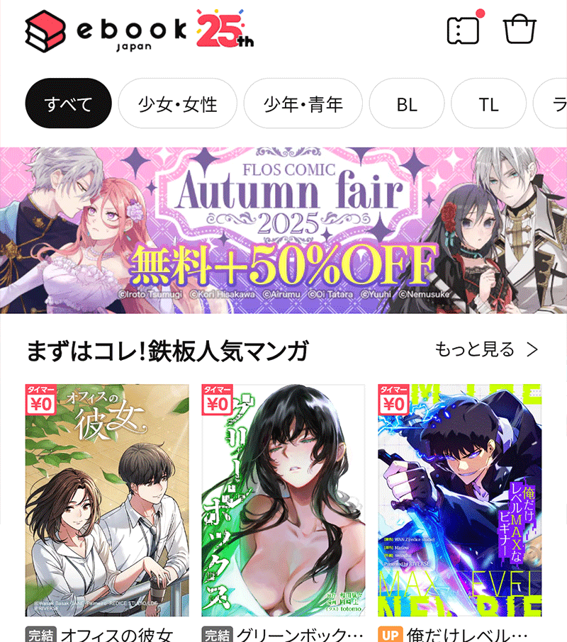 取り扱いジャンルは少年・少女・青年・女性向けなど幅広く、常時無料で読める作品や割引セールも多数開催。気になる作品を気軽に試せるのも嬉しいポイントです。
