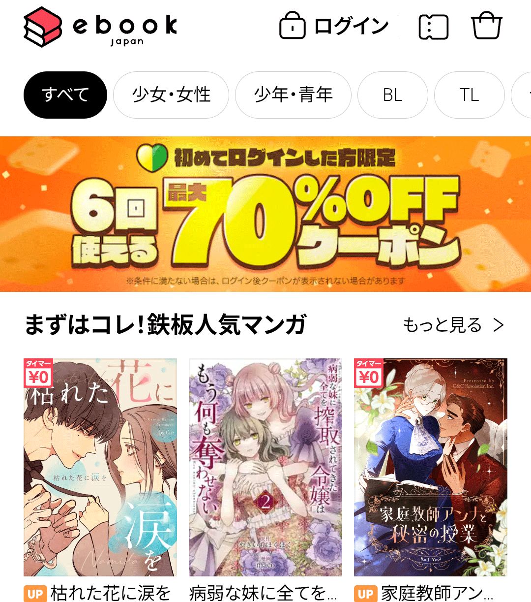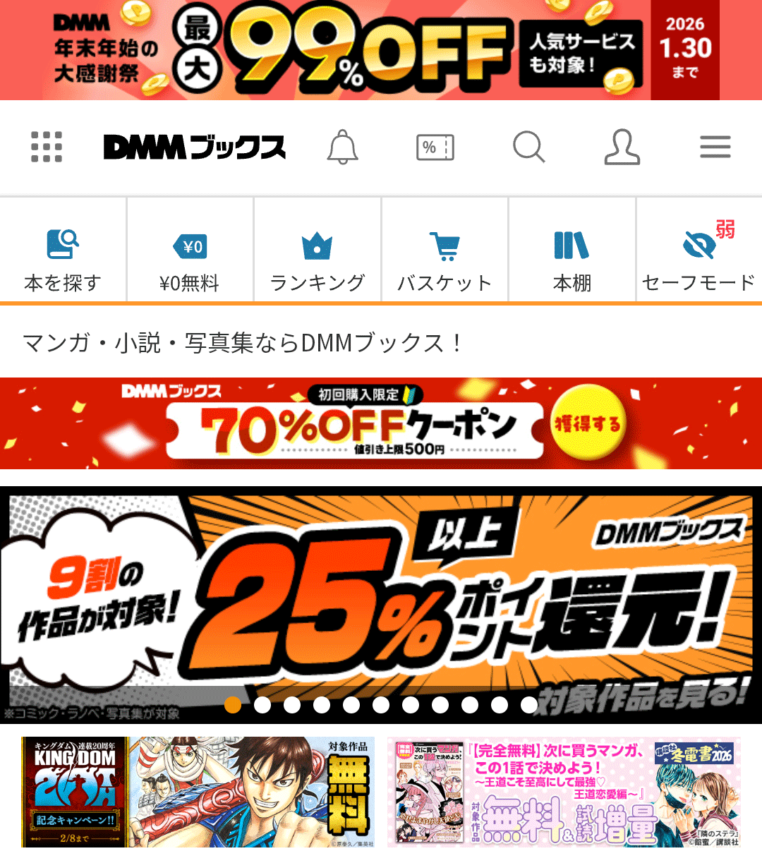 | 主な キャンペーン ※過去例含む | ●ポイント25%以上還元 ●初回購入70%OFF ●まとめ買いで15%OFF ……等 | ●指定ジャンル50%OFF ……等 | ●100円OFFクーポン ……等 |